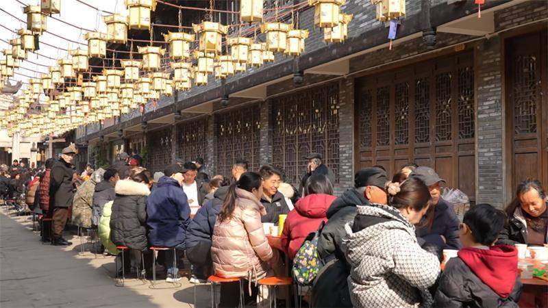 如果说年猪巡游是民俗的序曲,那么刨汤宴便是这场活动的重头戏。临近饭点,60张餐桌依次铺开,以川北传统“刨汤宴”为基底,融合昭化本土特色的美味佳肴接连上桌——经典八大碗“四荤四素、碗碗见礼”,承载着川北人家的待客之道。当地村民和游客围坐一堂,一边欣赏精彩节目,一边品尝特色美食,在推杯换盏间感受团圆之乐,共迎新春佳节。