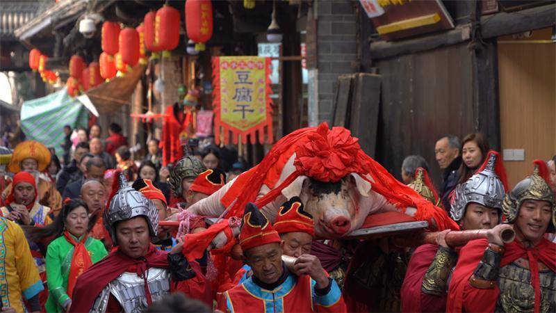 活动现场,民俗氛围拉满,节目表演、年猪巡游轮番上演,将川北民俗的质朴与热情展现得淋漓尽致。数名身着鲜红服饰的村民,将刚刚宰杀的年猪抬上古城街头巡游,沿途敲锣打鼓,用最朴素的方式向四方游客展示一年的劳动成果。热闹的场景吸引了不少游客主动加入巡游队伍,与村民并肩前行、挥手互动,亲身感受川北大地独有的民俗风情与新年喜悦,欢声笑语洒满千年古城。