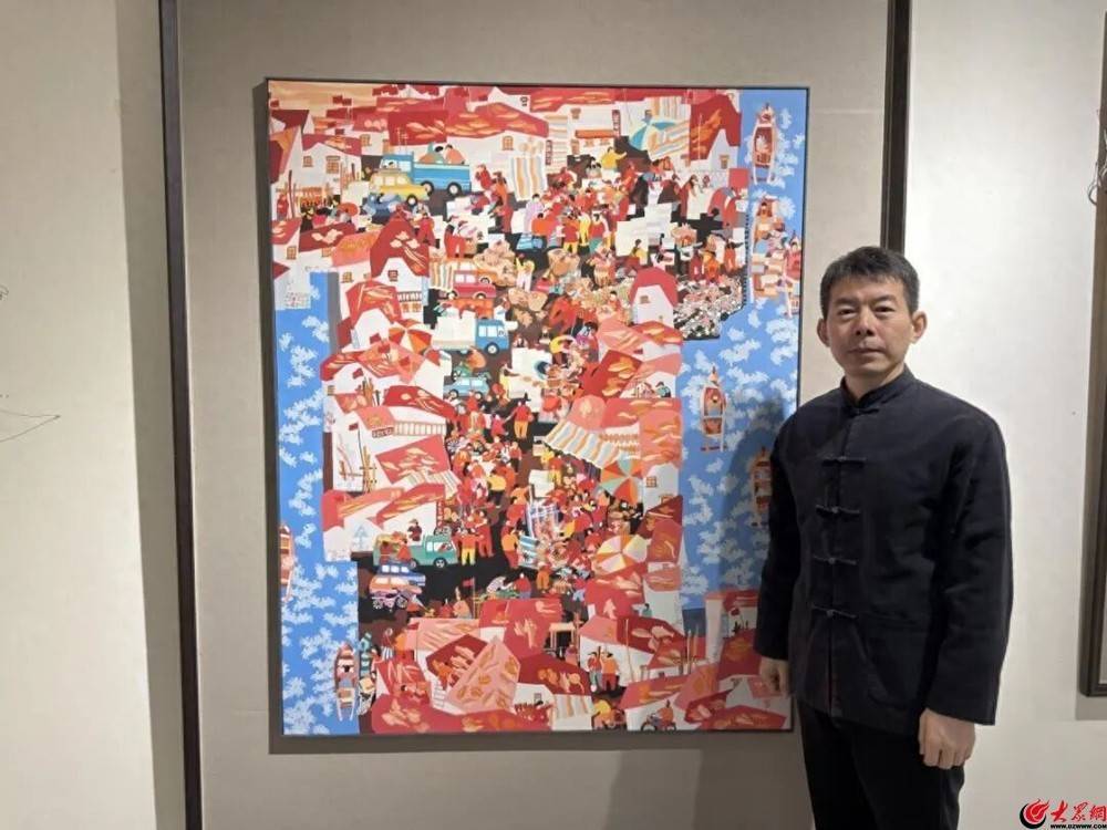 申遗工作成为他深入了解年画的契机。在梳理史料、走访老艺人的过程中,胶南年画扎根乡土、记录生活的文化基因深深打动了他。经过多年积累,他以灵山岛渔市为原型,耗时数月完成了《海港新曲》,这幅融合了传统技法与现代审美的作品,不仅入选第十三届全国美展,更荣获山东省泰山文艺奖,成为他年画创作生涯的里程碑。